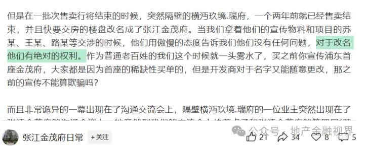 而最新交付的张江金茂府二期,也被购房者吐槽“严重降标”。一网友创建了一个名为“张江金茂府日常”的公众号,记录了其买房后的情况。在这个公众号中可以看到两篇文章,《你们都被放弃的那些宣传欺骗了?》、《如果你也想购买张江金茂府》,其中提到了两个问题,其中一个是关于隔壁横沔玖境·瑞府改名的协议。
