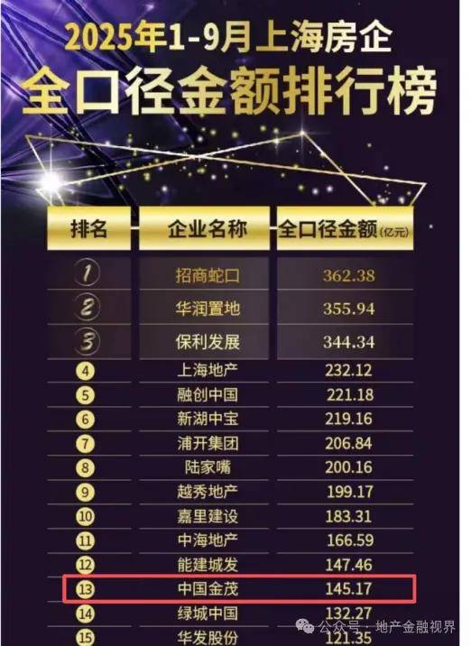 除了金茂上海项目遭遇维权、销售数据被质疑“注水”等问题,金茂上海区域的销售业绩也不容乐观。克而瑞数据显示,2025年1-9月,中国金茂上海区域全口径销售额为145.17亿元,在上海房企销售额排名第13位,与前三位的招商蛇口、华润置地、保利发展存在约200亿元的差距。