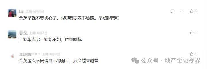 在上述公众号的评论区当中,有网友表示“二期车库比一期都不如,严重降标”,还有网友坦言“金茂这么不爱惜自己的羽毛,只会越来越差”。