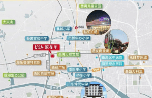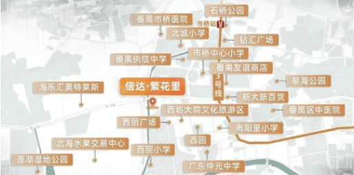 信达·繁花里位于番禺市桥禺山大道南侧,属于番禺传统行政与生活核心区。这里不是“未来规划”,而是已经成熟的番禺心脏地带:
