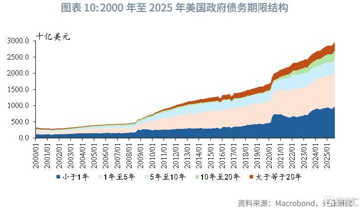 第三轮债务周期开启后,长债利率开启漫长下行,直至2020年10年美债利率最低逼近0.5%后开启反弹,此后最高触及 5%。整体来看,疫情后美国劳动年龄人口增速虽短暂回升,但主要依赖移民拉动,而在当前右翼力量上升、移民政策趋紧的大环境下,这一支撑难以持续。在这种低潜在增长与弱人口结构背景下,目前推升长期利率的核心压力主要来自另一端:自2000年以来货币增速长期快于产出增速,形成了持续性的货币超发力量。