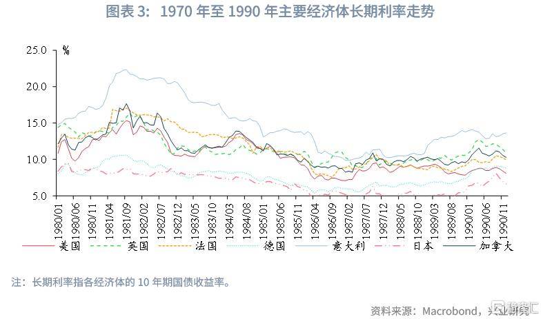 1980年代中后期,在通胀预期锚定后,美国长期利率中枢开始下移;相比之下,德国因市场深度与流动性不及美国、期限溢价更高,其长期利率略高于美国。法国、加拿大、意大利与英国的长期利率则普遍高于德国,反映出各自通胀预期与财政状况的差异。这种“美国为全球锚、德国为欧洲锚”的格局一直延续到1990年代欧元体系逐步成形。在欧盟框架确立后,欧洲内部利差收敛,全球利率体系的层级结构被重新塑造。