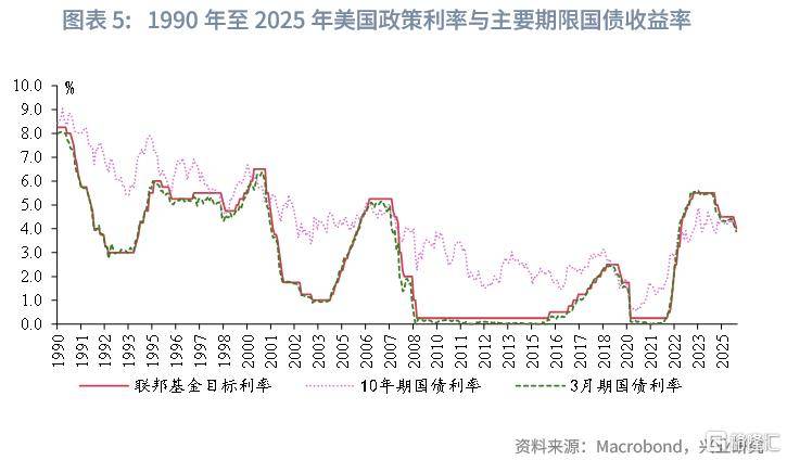 2015年底,为推动货币政策回归常态并防止经济过热,美联储启动加息周期,至2018年底累计加息9次共225bp,将目标利率提升至2.25%-2.5%,但总体加息进程非常缓慢。期间,短期利率随着加息进程稳步抬升至约2.5%,而长期利率却呈现“先降后升”的走势。原因在于,2016年英国脱欧公投引发全球避险情绪飙升,大量资金流入美国债市,美国长期利率一度跌破1.5%,创历史新低;公投结束后,伴随避险情绪消退、风险偏好恢复,美国长期利率逐步回升,于2018年底至3%左右。随着经济不确定性上升以及美元流动性紧张,美联储自2019年8月再度开启降息周期并扩表,连续三次降息共75bp至1.75%。长期利率提前反应,自2018年底的3%持续下行至2019年8月的1.5%,后随着降息落地而小幅反弹。