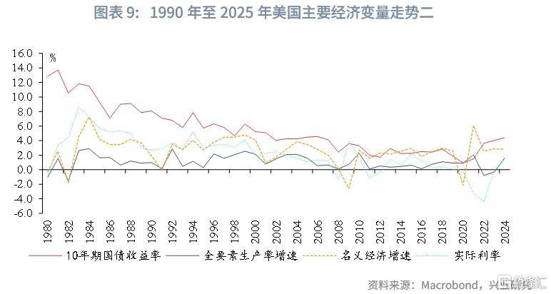 具体来看,在2009年至2014年,美联储通过三轮量化宽松和零利率政策大幅压低收益率曲线。长期利率在此期间持续下行,并于2012年7月降至约1.5%。随着经济复苏,长期利率在2013年升至2%以上,并在QE退出预期驱动下于2013年底升至约3%。2014年,受通胀预期持续走弱、期限溢价收窄等影响,长期利率再度回落至约2 %。同一时期,3个月期国债收益率长期徘徊在零附近,全要素生产率增速亦接近零。可见当时美国名义增长更多依赖货币化刺激,而非生产率改善。