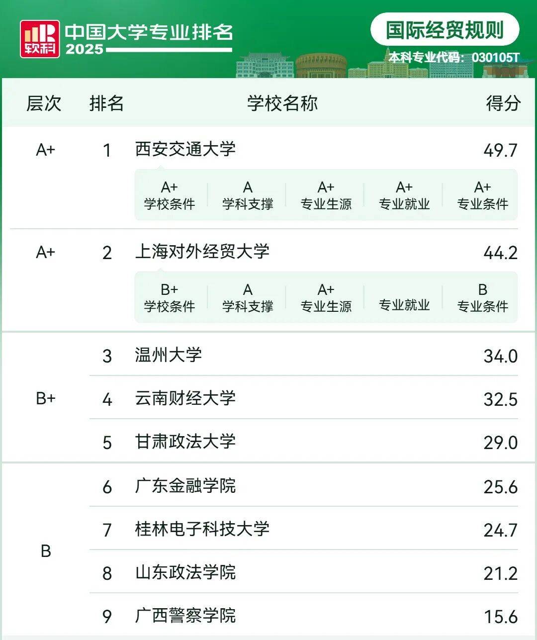 如西安交通大学是全国“双一流”高校率先设立国际经贸规则本科专业,2024年和2025年软科专业排名连续全国第1。实行“中外贯通”式涉外法治人才培养,与澳大利亚新南威尔士大学(世界法学排名前10)实施“中国本科+澳大利亚J.D.双学位计划”。