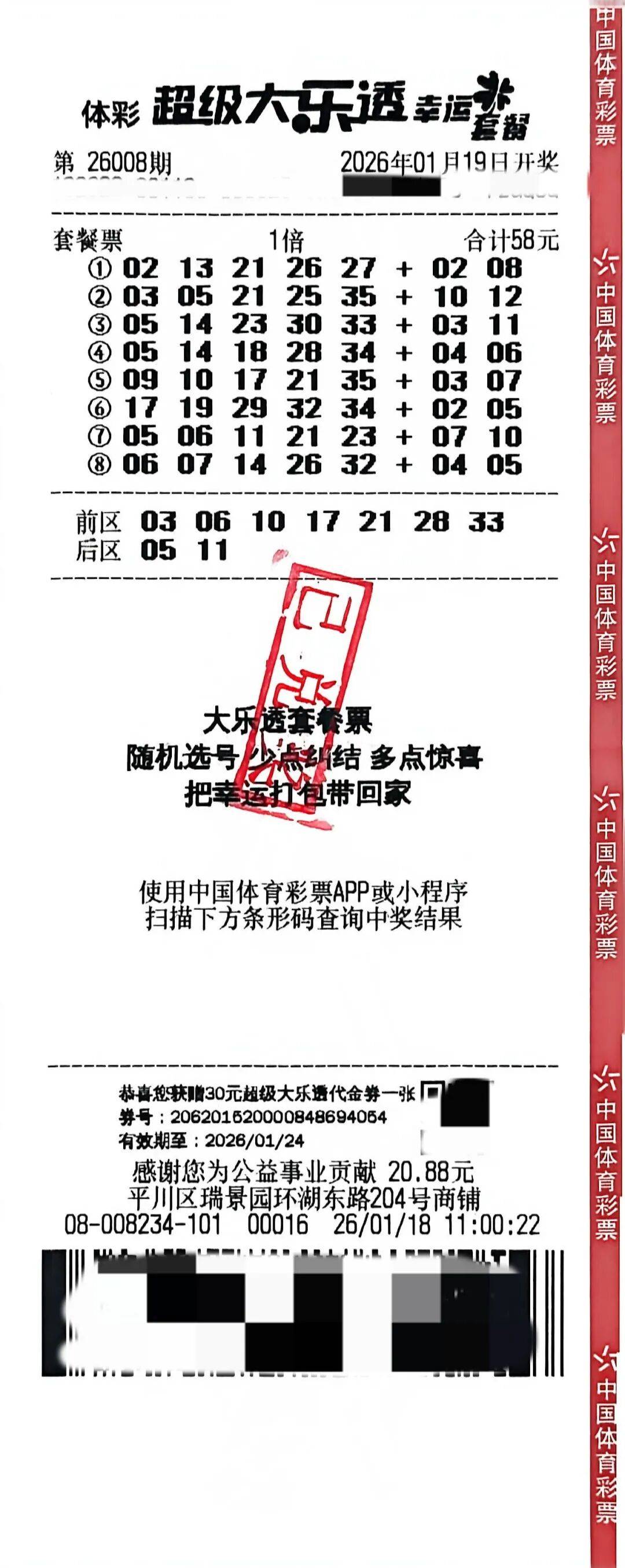 58元超级大乐透套餐票就能获得30元代金券,下班路过我就买了‘一套’,我是体育彩票忠实‘粉丝’,这样的活动哪能错过!”据了解,本次中奖正是周先生在小区附近体彩实体店购买的超级大乐透58元套餐票中7+2复式号码为他带来的“超级幸运”。